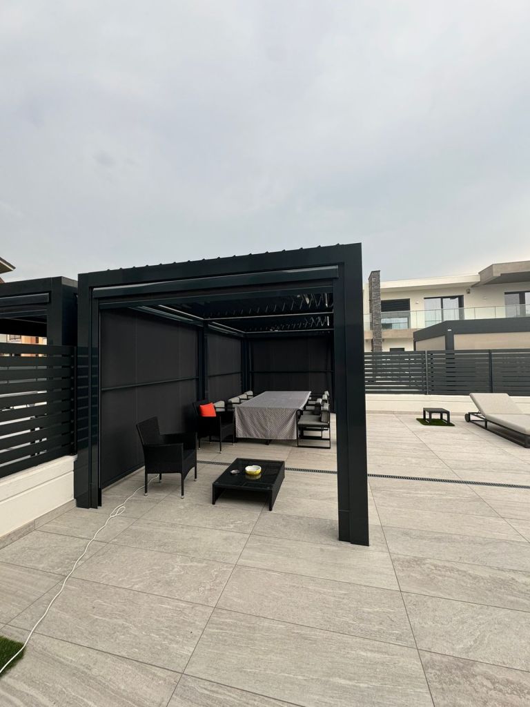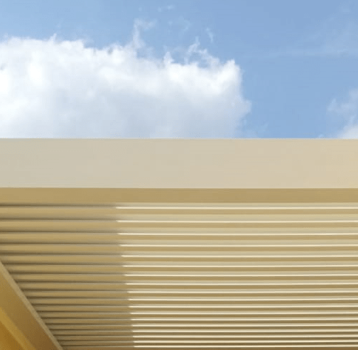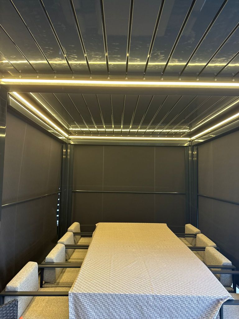 lamelle sono totalmente chiuse, protegge dalla pioggia, favorendo il deflusso dell’acqua lungo i bordi esterni della struttura, garantendo protezione e comfort.