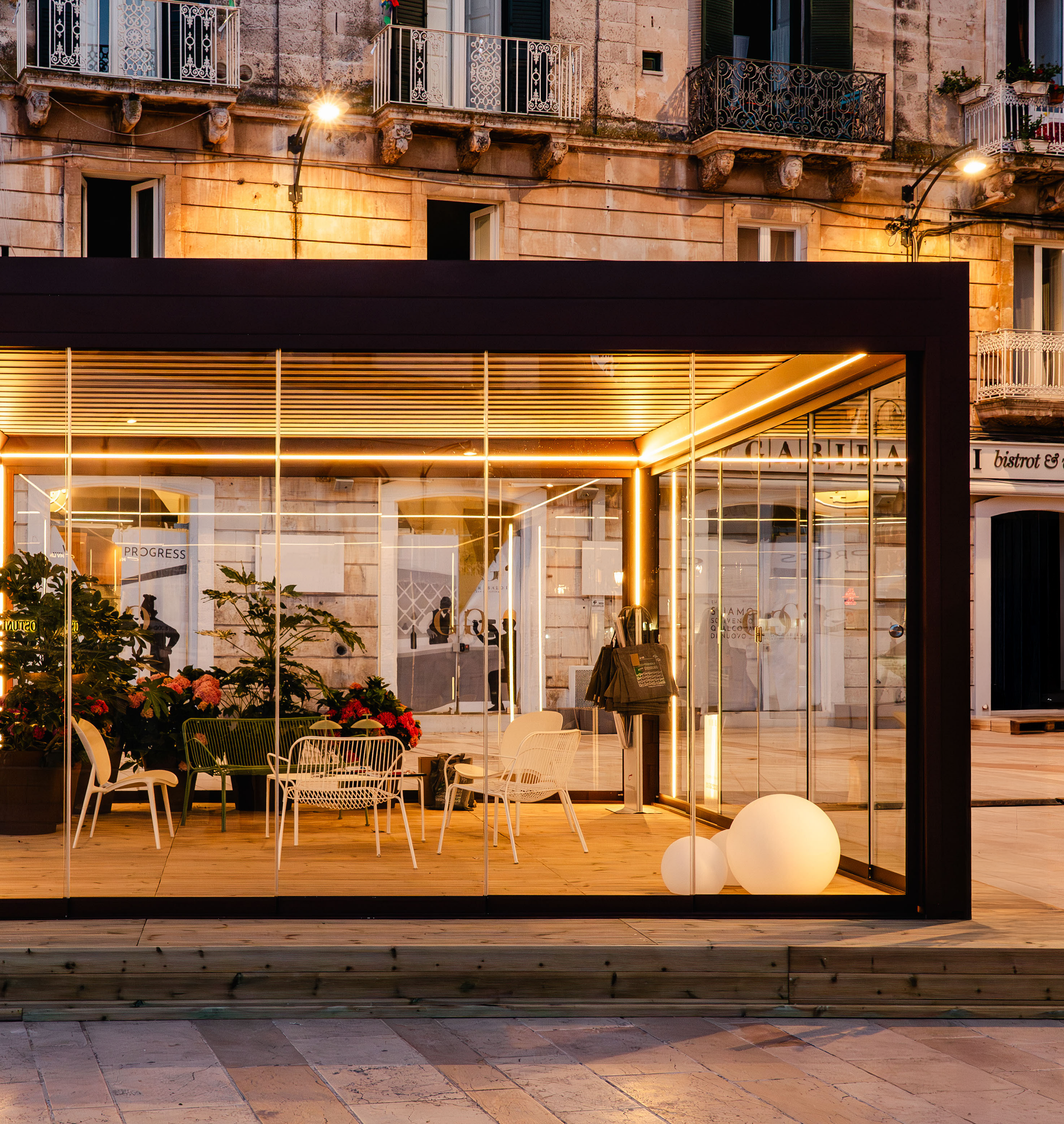 Le lamelle possono essere orientate manualmente o con telecomando. In posizione aperta permetteranno la circolazione dell’aria, in posizione inclinata fungeranno da protezione solare, mentre in posizione chiusa proteggeranno dalla pioggia.