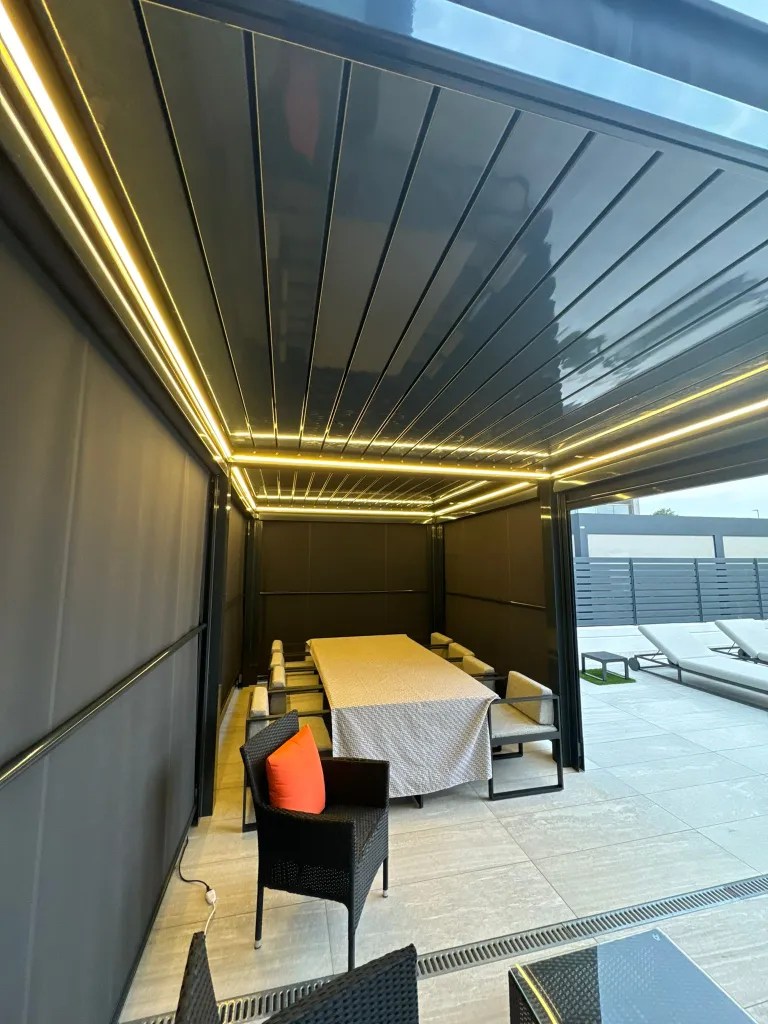 La pergola bioclimatica è quindi un riparo che si adatta alle intemperie, e sono proprio le lamelle che lo consentono.